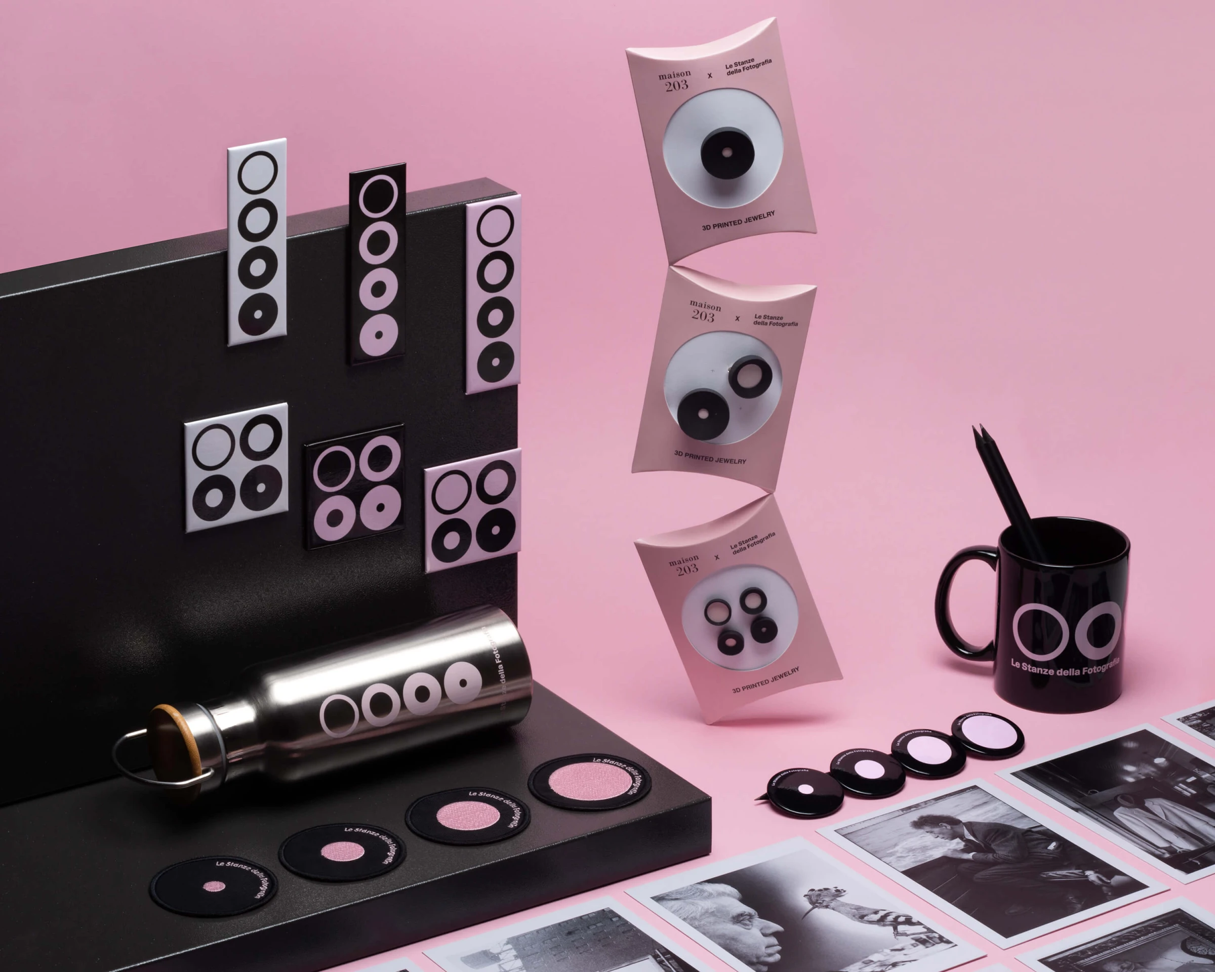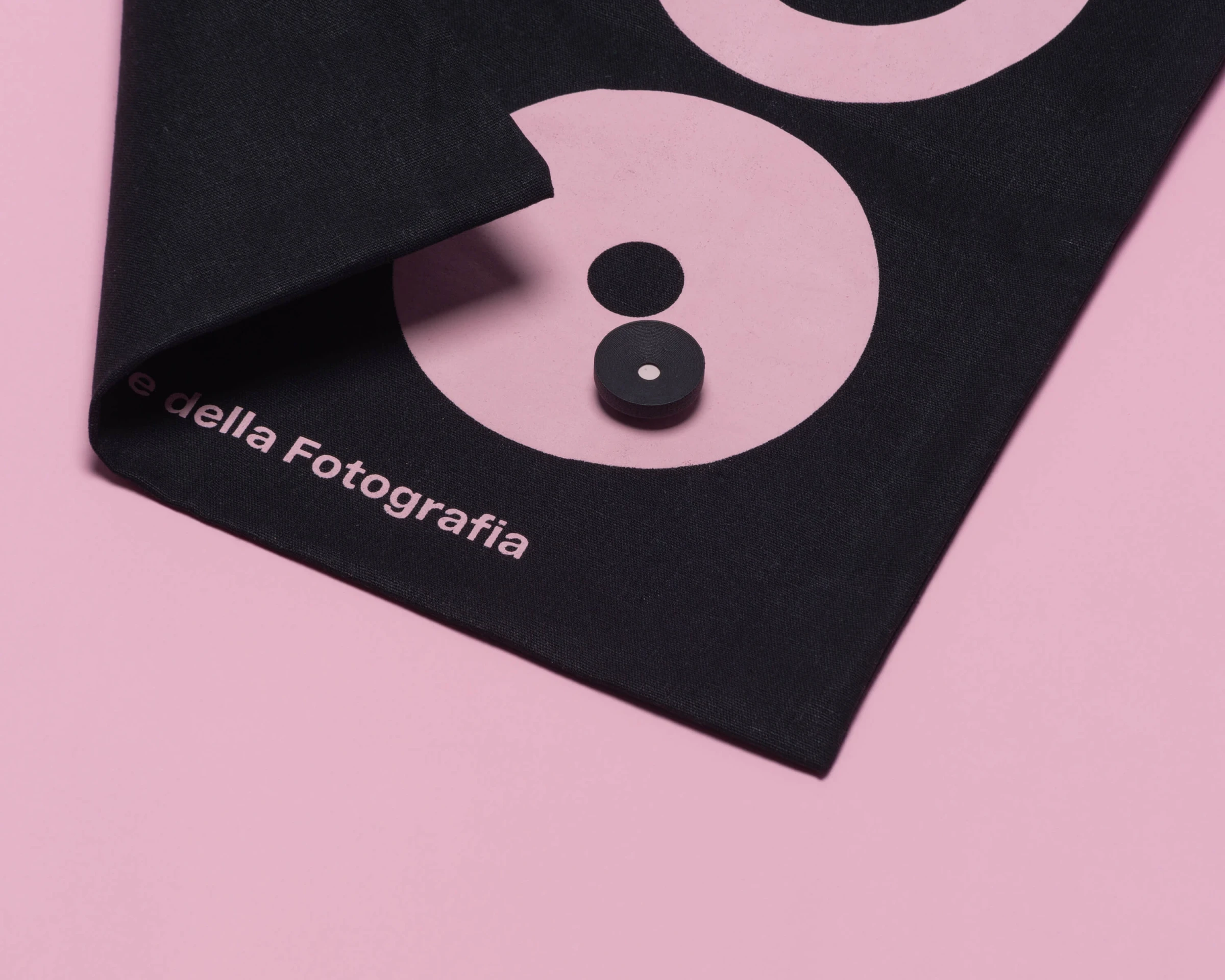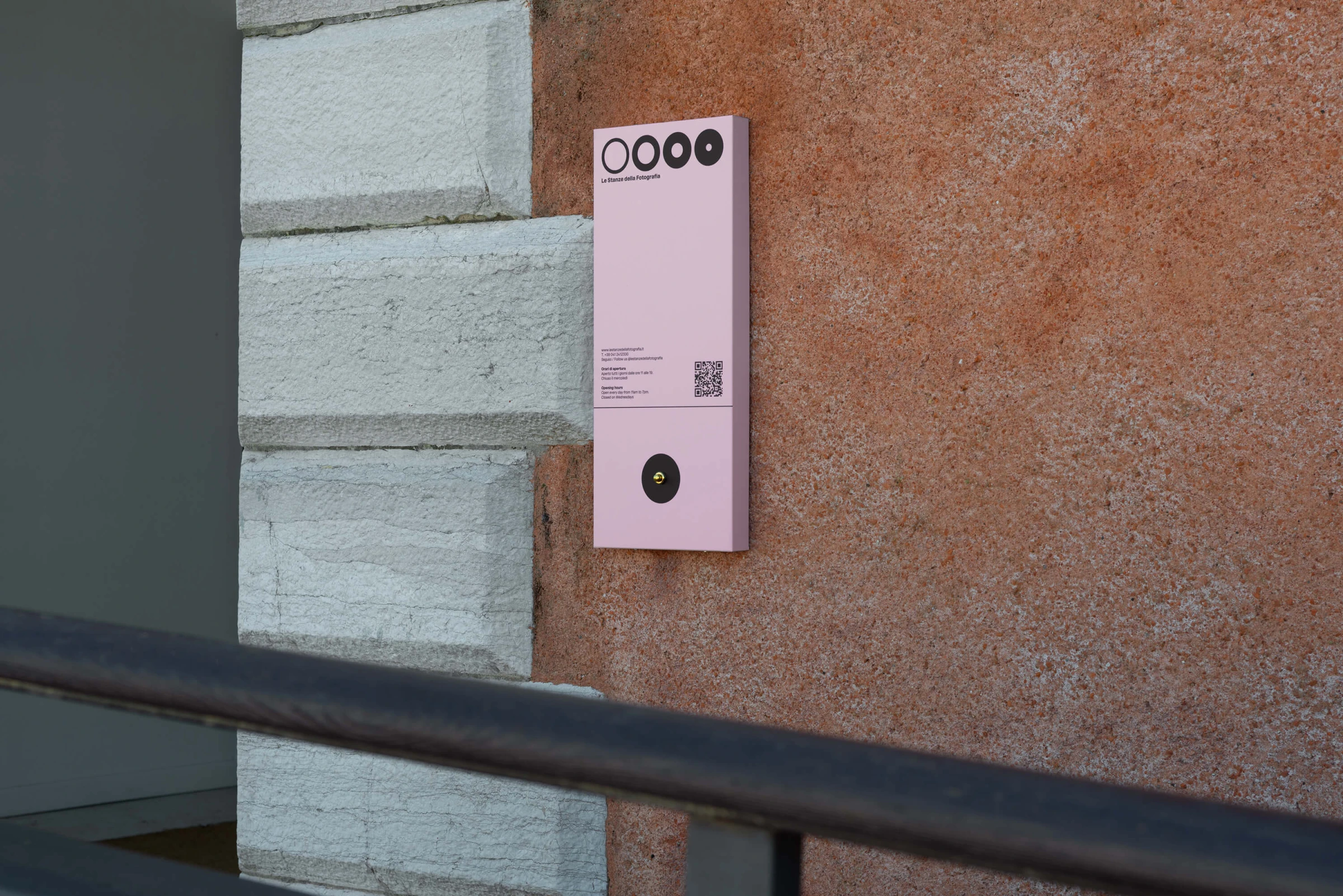 Pink becomes the distinctive element of the identity. An unexpected choice within the institutional context of photography, it creates immediate recognizability and strong spatial presence. The colour runs across all communication materials, contrasting with the black and white of the images. It does not decorate — it identifies, orients and defines the space.
