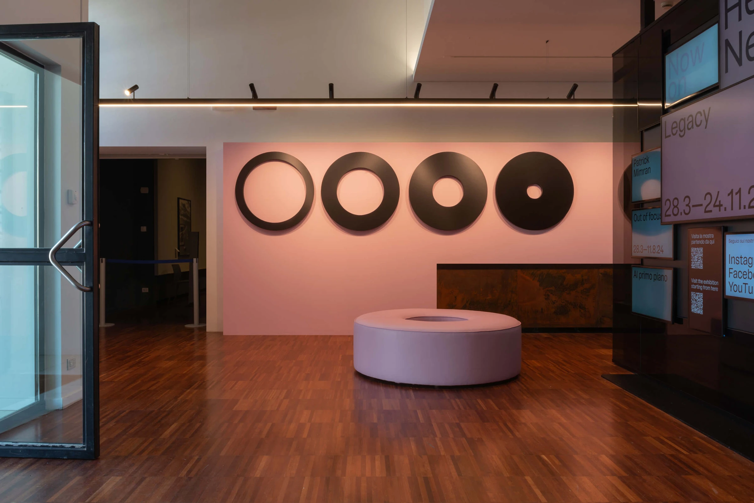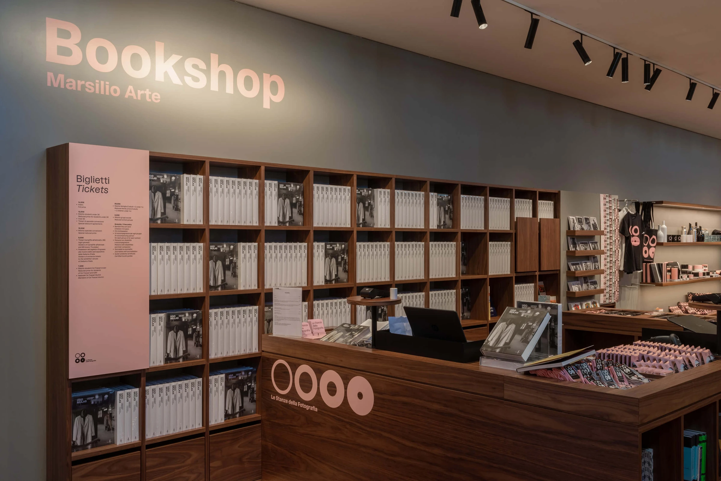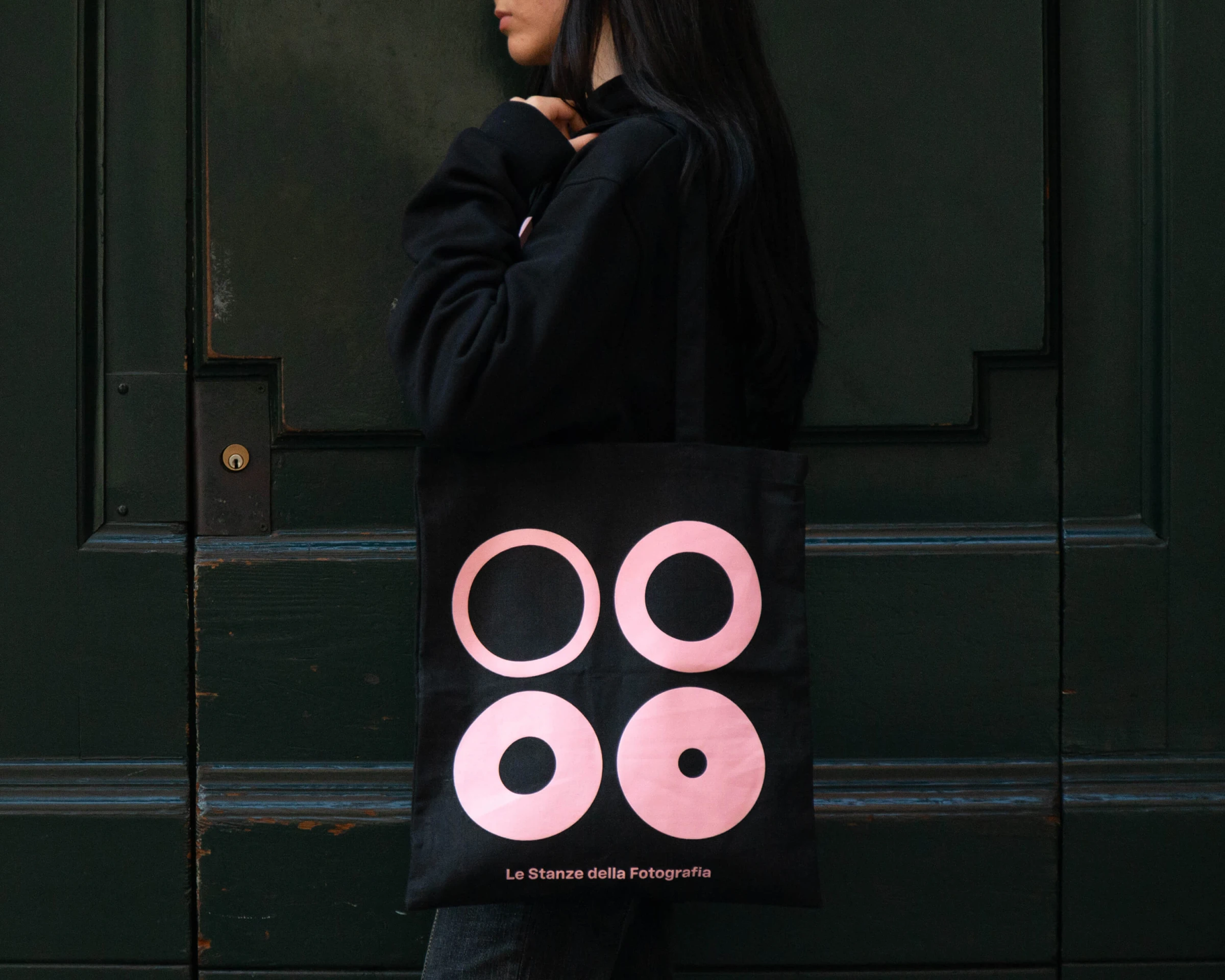 Pink becomes the distinctive element of the identity. An unexpected choice within the institutional context of photography, it creates immediate recognizability and strong spatial presence. The colour runs across all communication materials, contrasting with the black and white of the images. It does not decorate — it identifies, orients and defines the space.