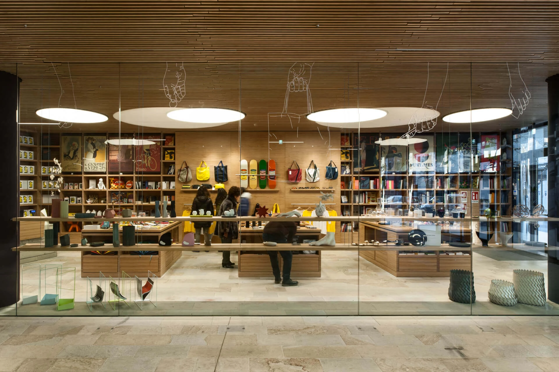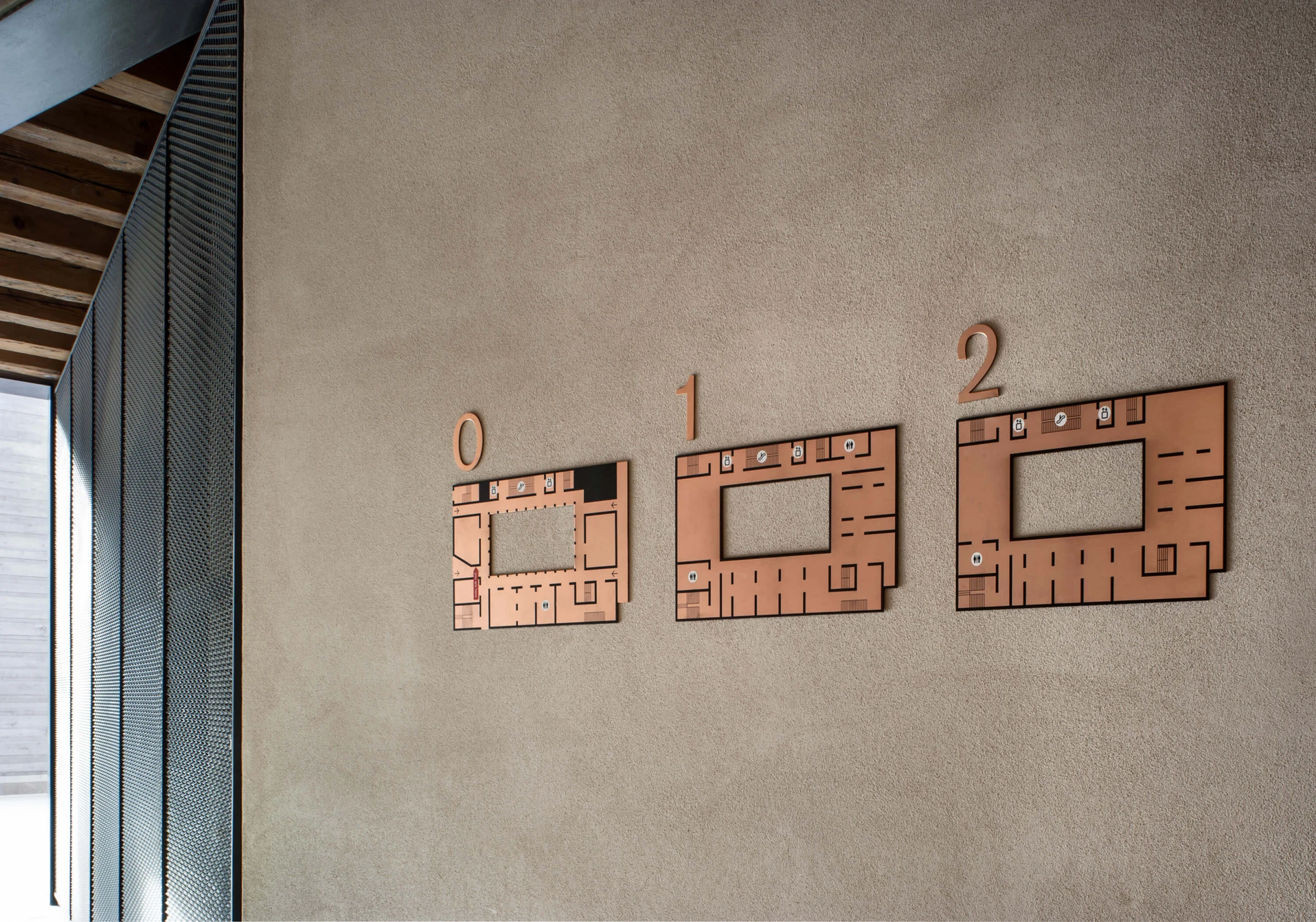 CamuffoLab designed an entirely analog wayfinding system, differentiating materials and functions: iron for the signage inside the museum, copper for the external system, in dialogue with the urban context. The project works through reduction, relying on materials, proportions, and formal clarity. Retail spaces — the bookshop and the restaurant — were enriched with illustrations that echo the visual language of the museum interiors, extending it across the district. The result is a coherent and discreet system, conceived to orient and accompany visitors while leaving room for architecture and experience.
